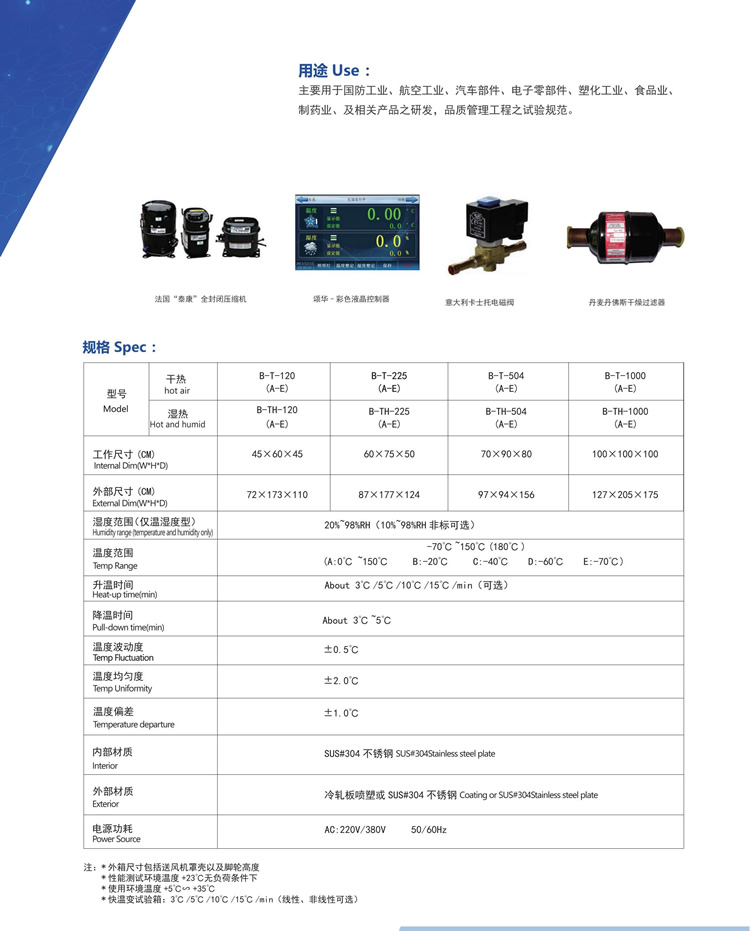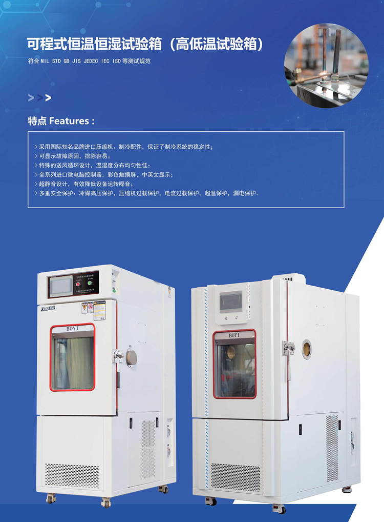 高低溫試驗箱為實現溫度度變化針對產品的可靠性驗證,主要為航空、航天、汽車、材料、石油、化工、電子、通訊等科研及生產單位提供溫度變化環境,供用戶對整機(或部件)、電器、儀器、材料等作溫度應力篩選試驗,以便考核試品的適應性或對試品的行為作出評價,真實地反映電工電子產品在實際使用過程中對溫濕度環境變化的適應性,暴露產品的缺陷,是新產品研制、樣機試驗、產品合格鑒定試驗全過程必不可少的重要試驗手段。
