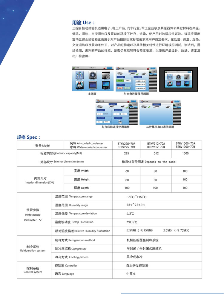 本產(chǎn)品是模擬GB/T10586-2006濕熱試驗(yàn)箱技術(shù)條件;GB/T10589-2008低溫試驗(yàn)箱技術(shù)條件;GB/T11158-2008高溫試驗(yàn)箱技術(shù)條件制造,主要為航天、航空、石油、化工、軍事、汽車(摩托車)、船舶、電子、通訊等科研及生產(chǎn)單位提供溫濕度變化環(huán)境,模擬試品在溫濕度變化環(huán)境條件下的環(huán)境應(yīng)力篩選試驗(yàn)、環(huán)境試驗(yàn)、可靠性試驗(yàn)