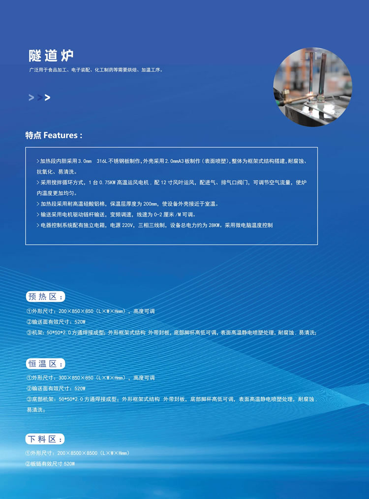 烘干溫度可控:隧道爐烘干線具有的溫度控制系統,可以根據需要設置烘干溫度,保證烘干的質量和效果。