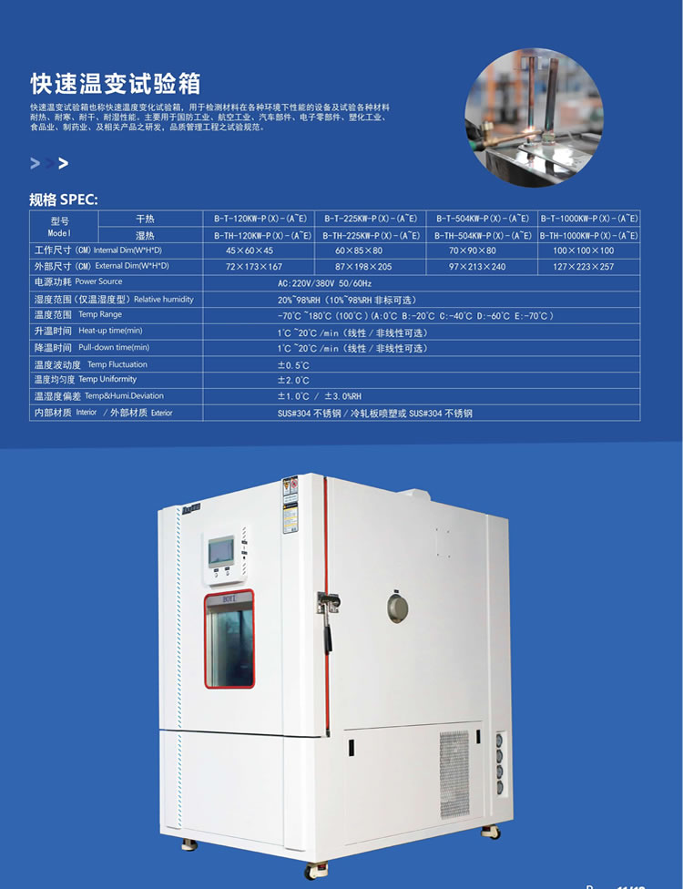 快速溫變試驗箱為實現(xiàn)溫度變化針對產(chǎn)品的可靠性驗證,主要為航空、 航天、汽車、材料、石油、化工、電子、通訊等科研及生產(chǎn)單位提供溫度變 化環(huán)境,供用戶對整機 (或部件) 、電器、儀器、材料等作溫度應(yīng)力篩選試 驗,以便考核試品的適應(yīng)性或?qū)υ嚻返男袨樽鞒鲈u價,真實地反映電工電子 產(chǎn)品在實際使用過程中對溫度環(huán)境變化的適應(yīng)性,暴露產(chǎn)品的缺陷,是新產(chǎn)品研制、樣機試驗、產(chǎn)品合格鑒定試驗全過程必不可少的重要試驗手段