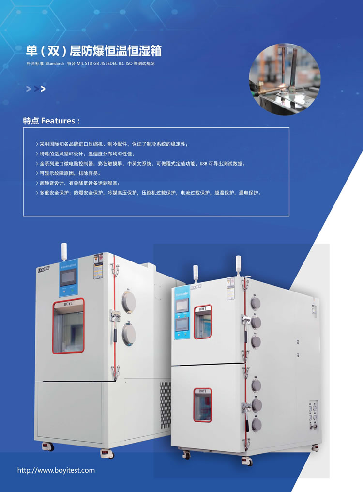 防爆恒溫恒濕試驗箱主要適用鋰離子電池,鉛酸電池,鎘鎳電池,鎳氫電池包生產或試驗及溫度模擬。支持電池組循環壽命試驗,高溫存儲,濕熱循環, 冷啟動,凝露試驗,電池容量試驗,充放電特性試驗,荷電保持能力試驗,充放電效率試驗等。